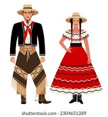 The traditional dress in Argentina is a functional, rustic type wear that is suitable for rural life on the plains and horseback riding. Traditional clothing for men is like that of western cowboys.  It consists of ‘bombachas’, which is a wide, baggy pair of pants that end at the ankle, practically designed for comfort while horseback riding.  There is usually a piece of cloth that is passed between the legs and then fastened at the waist with a belt over the bombachas, called the ‘chiripa’.  This is intended to be a flexible garment that is also protective while on horseback.  Men also traditionally wear a poncho, a thick woolen cover with an opening for the head, that is intended for protection against the cold.  Ponchos are usually woven in vibrant patterns and colors.  Men also wear leather boots, a wide leather belt, a neck scarf, and a wide brimmed hat, all intended for protection against the weather and designed for functionality with horse riding.  Women, on the other hand, traditionally wear long dresses or flowy skirts with blouses, a shawl for warmth and hat for protection against the sun.  Women’s wear is usually decorated and embellished with vibrant, floral prints.  Please see image below.